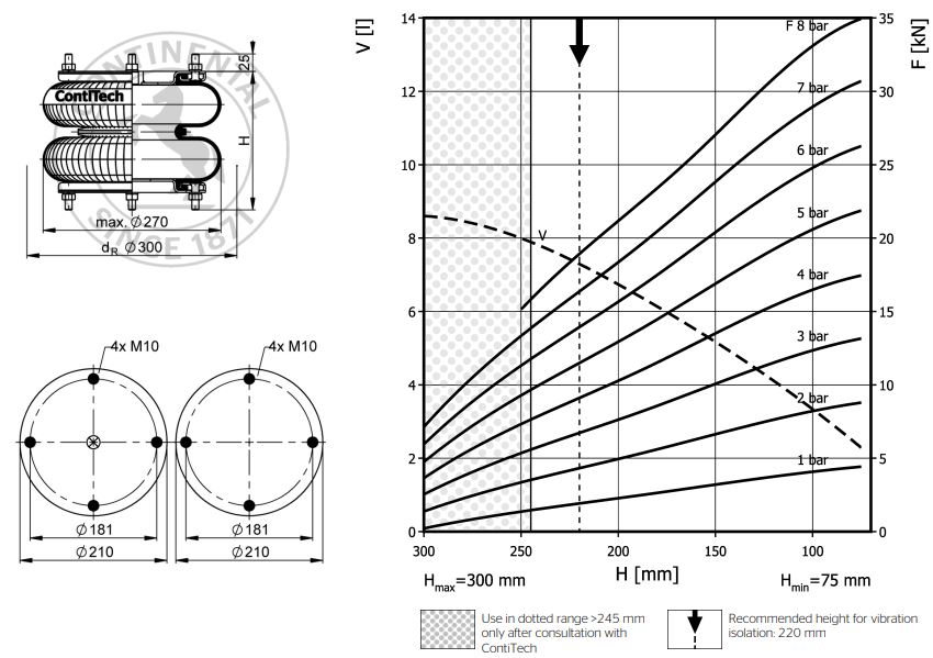 ContiTech FD 210-22 DS пневмоподушка. Максимальное рабочее давление 8 бар. Температура эксплуатации -40°C / +85°C. Резина – натуральный каучук.
