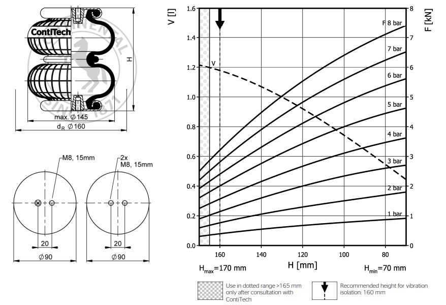 ContiTech FD 40-10 CI пневмоподушка. Максимальное рабочее давление 8 бар. Температура эксплуатации -40°C / +85°C. Резина – натуральный каучук.
