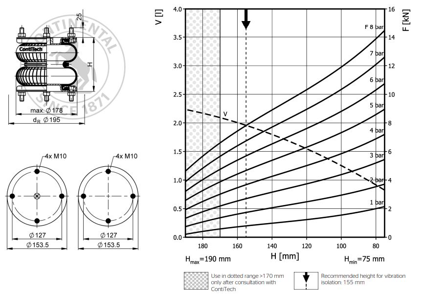 ContiTech FD 76-14 DS CR пневмоподушка. Максимальное рабочее давление 8 бар. Температура эксплуатации -40°C / +85°C. Резина – хлорбутадиеновая резина (неопреновая резина).