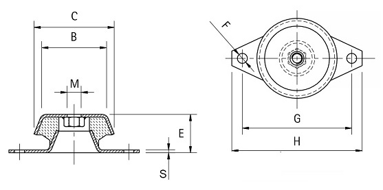 Виброопора Kolokol. Прочная конструкция. При ударной нагрузке — смягчение и ограничение. Компактные размеры. Простота установки. Защита от коррозии. Конструкция: оцинкованная сталь, резина между крышкой и основанием. Крепление к полу, резьба в крышке. Температура эксплуатации -40° +80C°