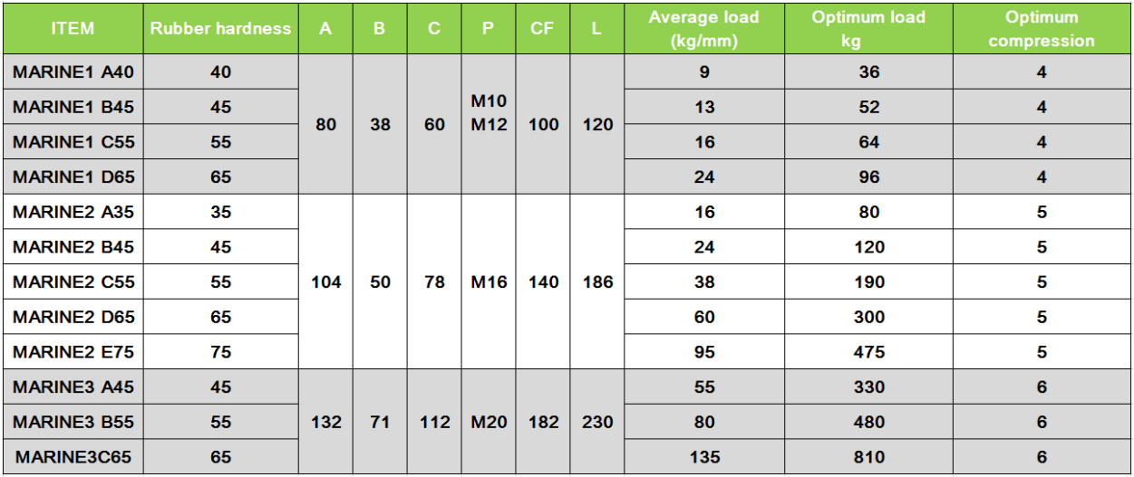 Виброопора Marine. Прочная конструкция. При ударной нагрузке — смягчение и ограничение. Защита от отрыва. Компактные размеры. Простота установки. Высокая прочность в горизонтальной плоскости. Защита от коррозии. Конструкция: оцинкованная сталь, резина между крышкой и основанием. Крепление к полу, резьба в крышке. Температура эксплуатации -40° +80C°